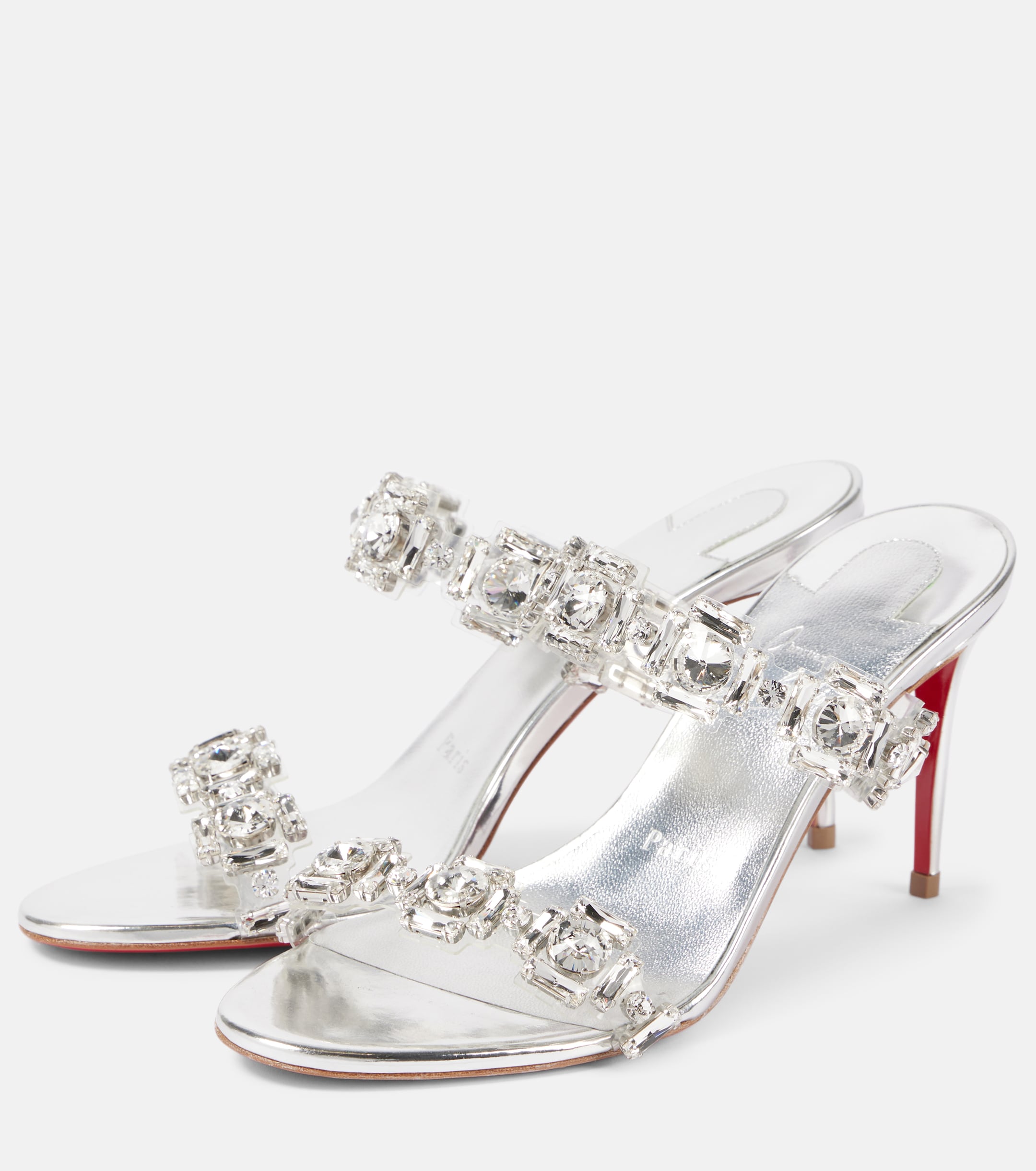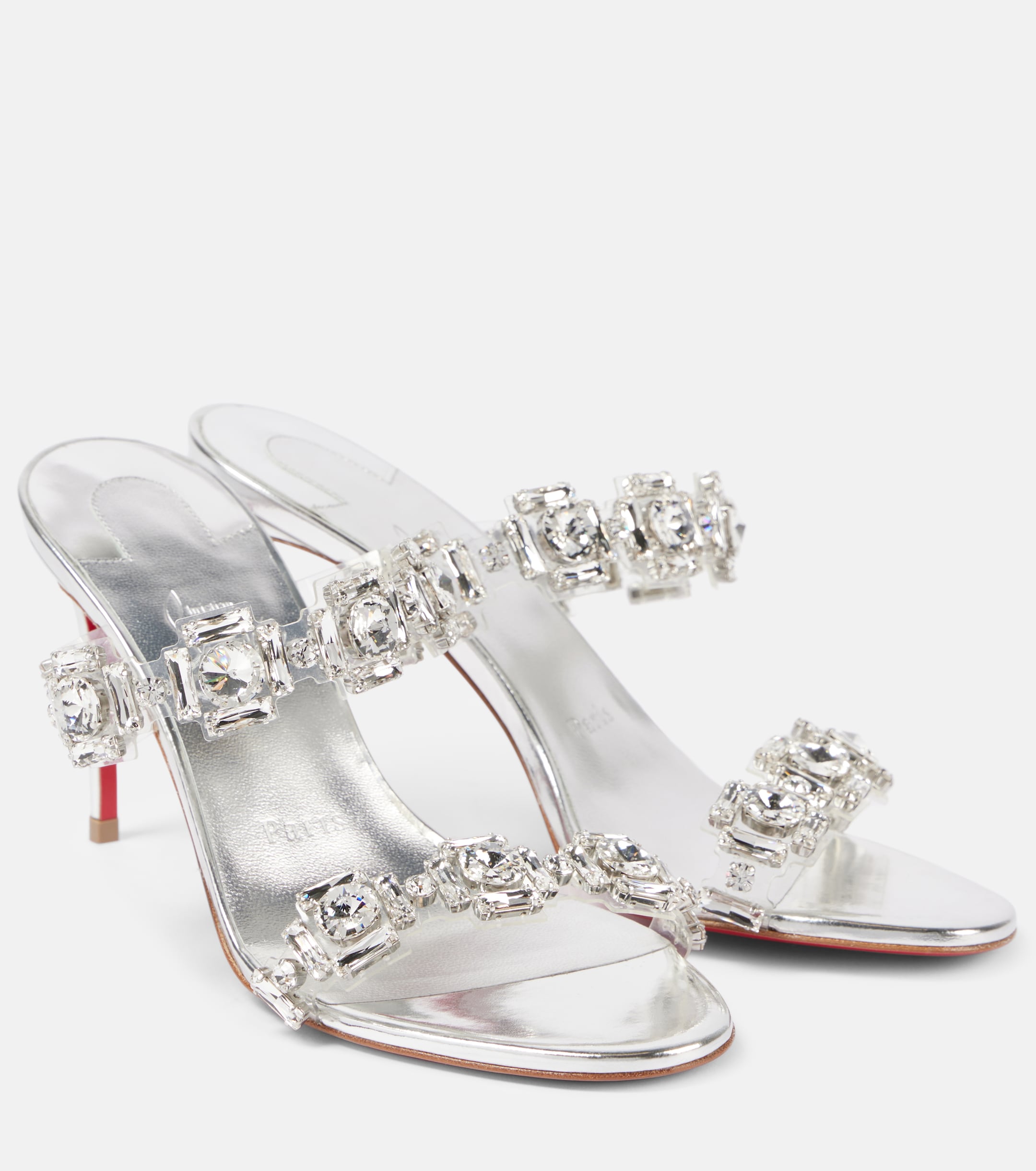 The refined Just Jewel mule highlights Maison Christian Louboutin’s savoir-faire, featuring an 85 mm slim heel and transparent PVC straps adorned with hand-applied silver jewels, crafted in silver laminated calf leather.