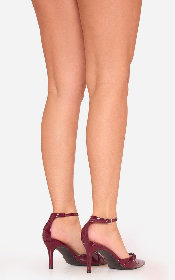 Step up your shoe game, doll! Featuring a burgundy patent material with a pointed toe, ankle strap, and buckle detail, these stiletto heels bring fierce attitude with a luxe edge. Perfect for making a bold statement!
