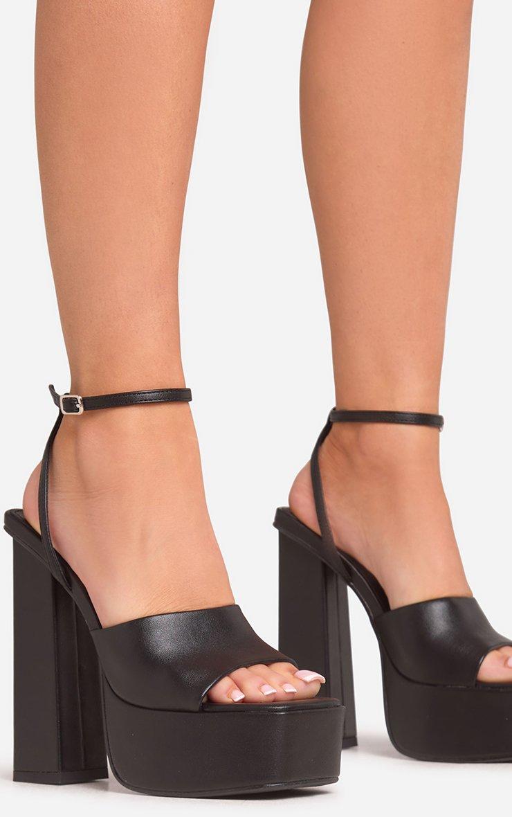 Ready to turn heads? Featuring a black faux leather material, ankle strap design, square peep toe, and extreme platform block heel, these heels are here to elevate your look with bold, fierce energy.