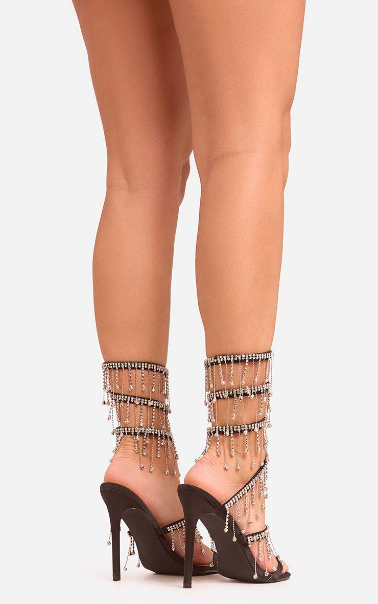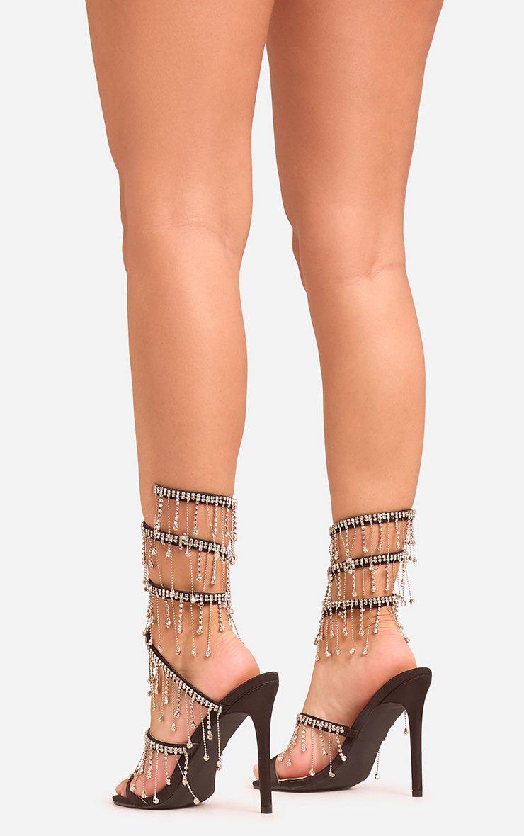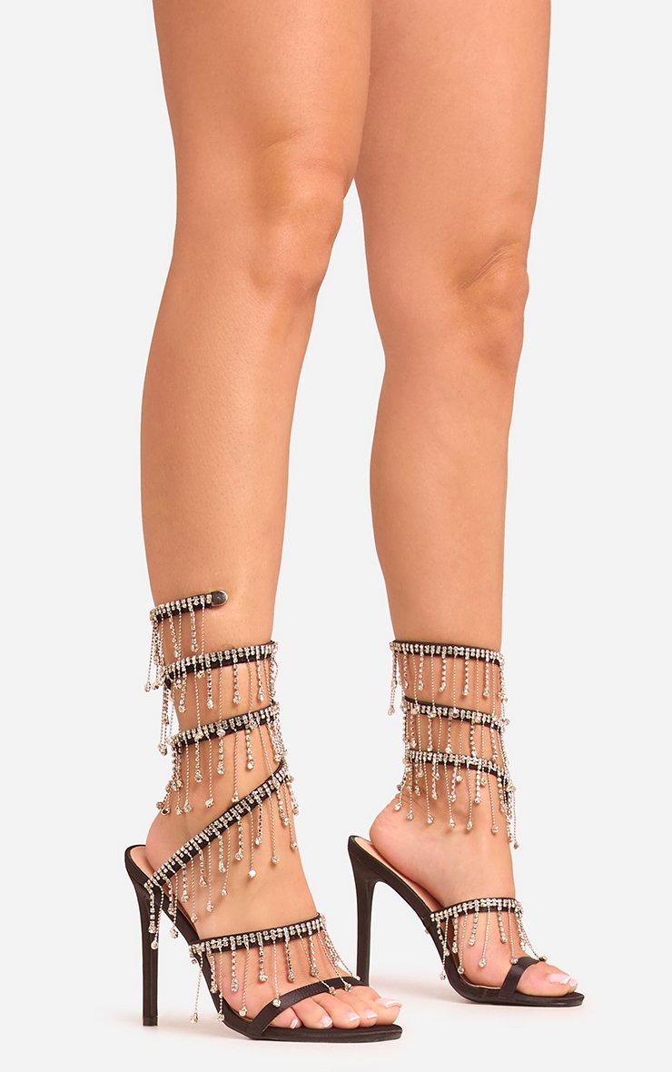 Cause instant shoe envy in our Xander Diamante Tassel Detail Wrap Around Strap Stiletto Heel In Black Satin. These black diamante stiletto heels deliver diva energy with their diamante tassel design, wrap around strap and luxe black satin fabric. Slip into these stiletto heels for a look that demands attention!