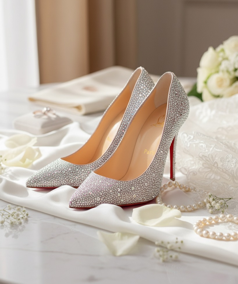 The Anouk pointy toe pump is characterized by its clean, simple silhouette. It is leather lined with a leather sole and finished with silver and ballet pink painted coarse glitter fabric upper. Made in Italy.