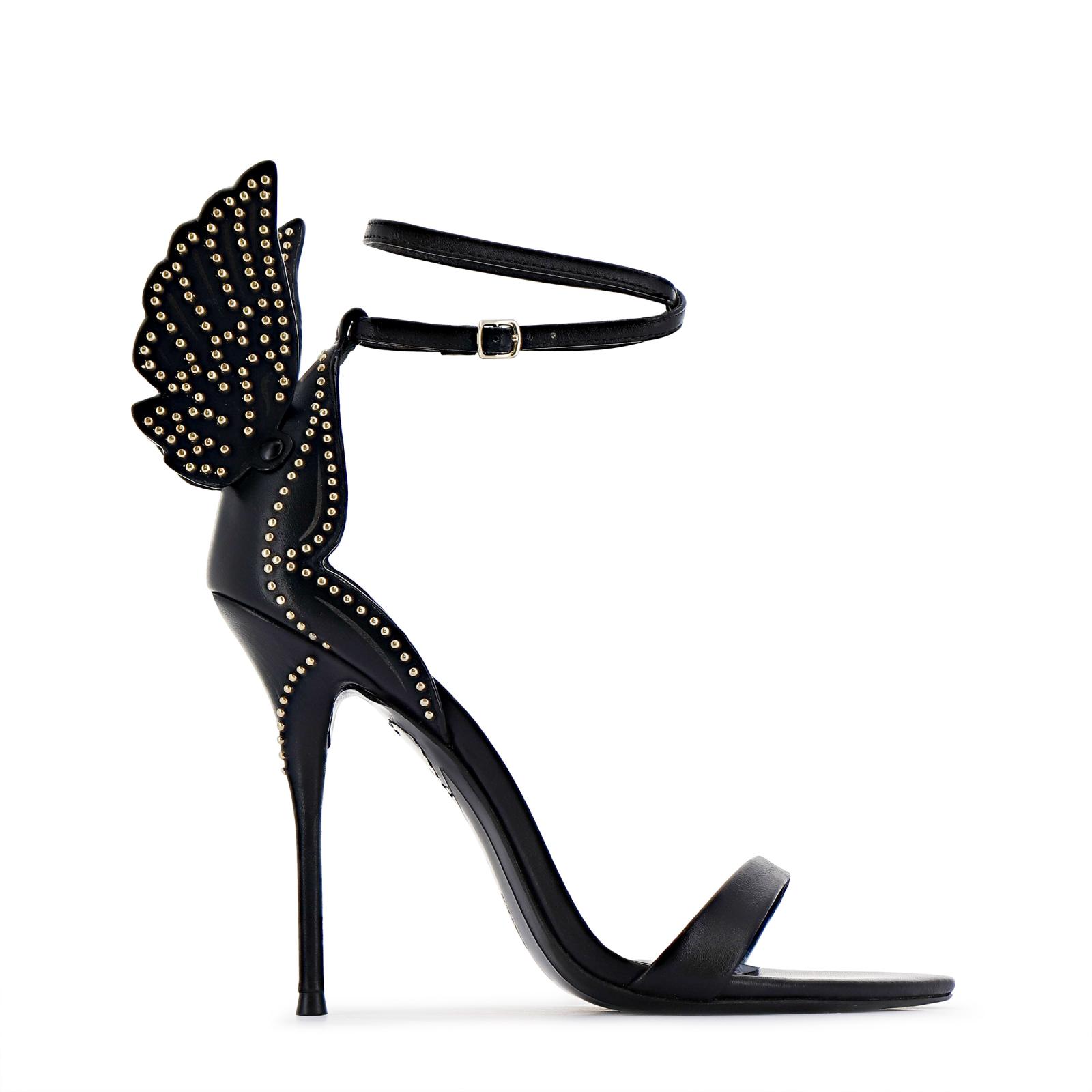 Saint meets siren. Meet our latest icon, this ‘Black’ leather Cherub Sandal turns heads with a dramatic 3D wing, embellished with gleaming gold studs. Perched on a sleek 100mm heel, with our classic double ankle strap, she’s fierce, feminine, and ready to take flight, day or night.